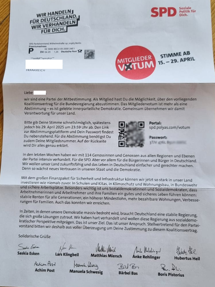 « Nous sommes un parti de codétermination. En tant que membre, vous avez la possibilité de voter sur l’accord de coalition actuel pour le gouvernement fédéral. Le vote des membres est plus qu’un simple vote : c’est une démocratie interne au parti. Ensemble, nous prenons la responsabilité de notre pays. »